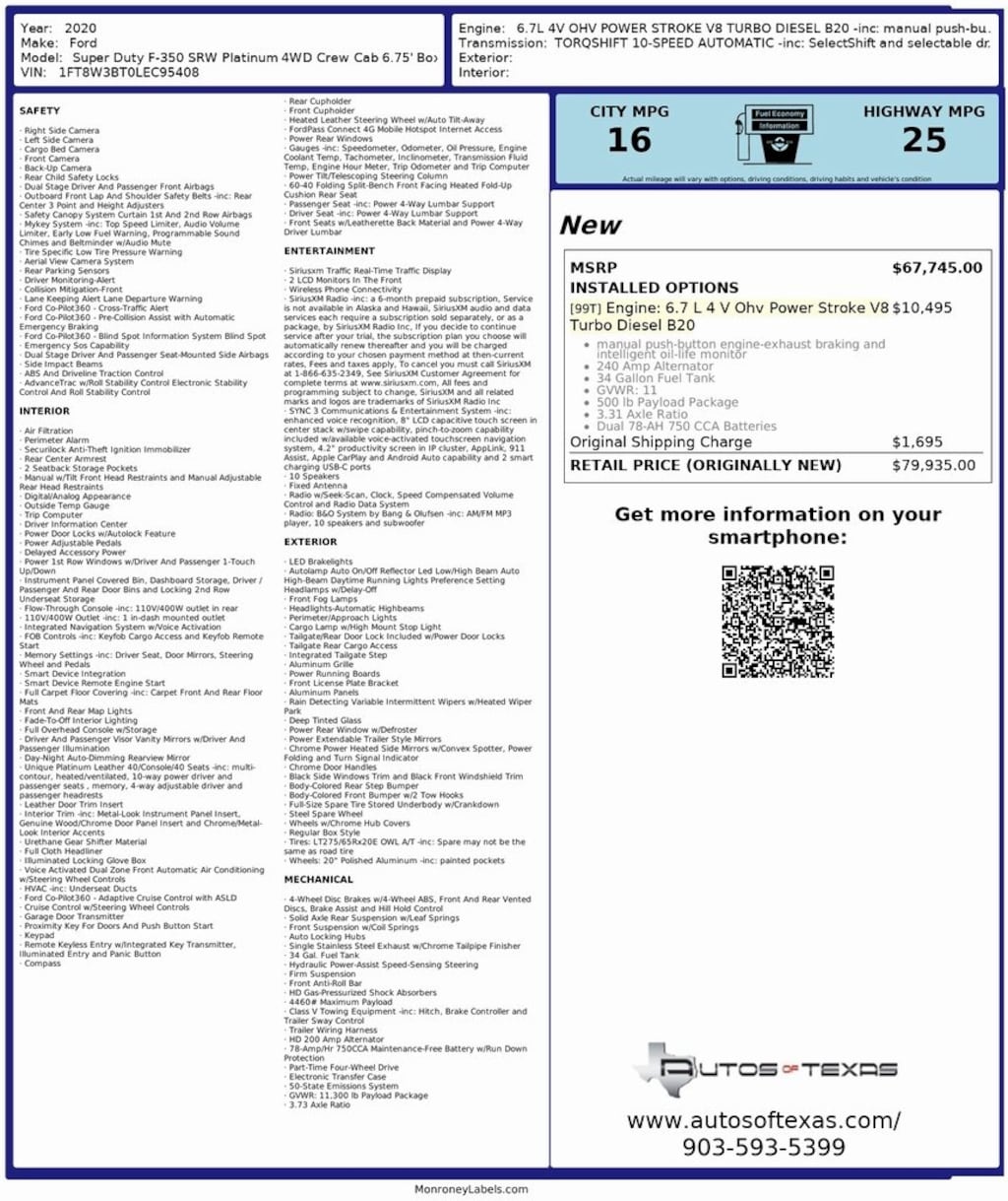 Agate Black Metallic 2020 Ford F-350SD Platinum 4WD 4D Crew Cab Power Stroke 6.7L V8 DI 32V OHV Turbodiesel 10-Speed Automatic